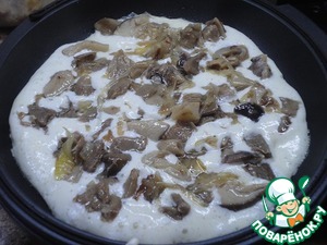 Из сырно-яичной массы испечь по очереди на сливочном масле два омлета. Когда они немного схватятся внизу, выложить грибы и накрыть крышкой.