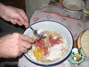 Добавить муку, сметану, соду, гашеную уксусом (соду можно и не добавлять, но мне кажется, что с содой получаются пышнее и лучше пропекаются), фарш. Посолить, поперчить.