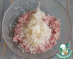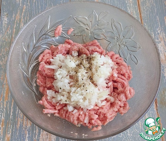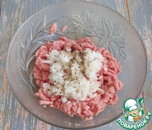 Лук почистить, помыть, мелко нарезать или измельчить в блендере. Соединить фарш (у меня свинина +говядина) с луком, добавить соль и перец, хорошо перемешать.