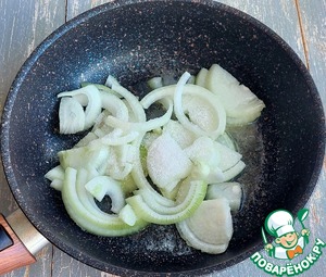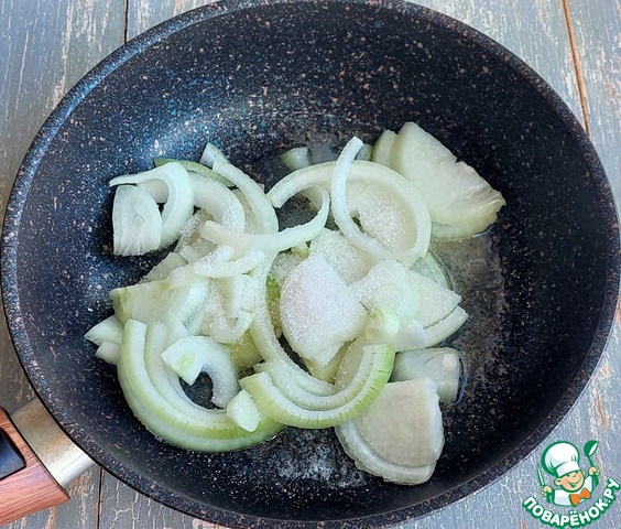 Добавить лук, нарезанный произвольно, соль и сахар.