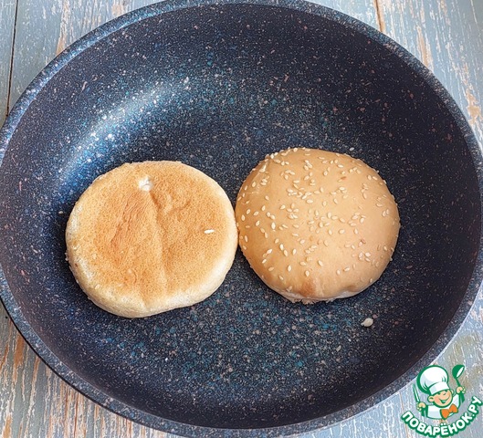 Булочки разрезать пополам, обжарить на сковороде срезом вниз.
