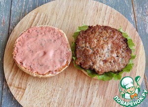 На нижнюю часть булочки положить лист салата, затем котлету.