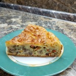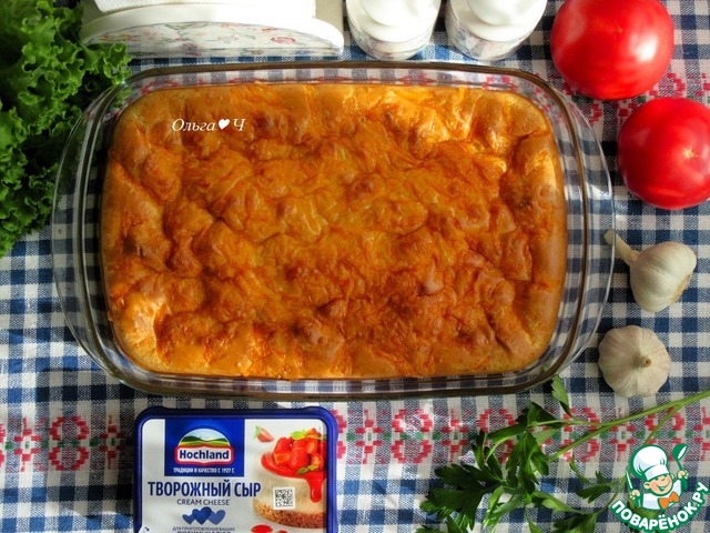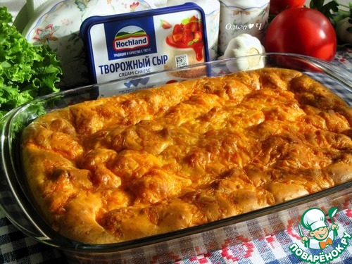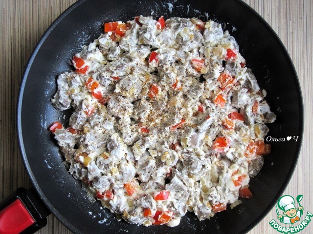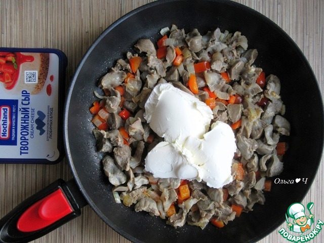 Теплый заливной пирог с куриными желудочками, сладким перцем и творожным сыром ТМ Hochland можно смело подавать на ужин, дополнив салатом из свежих овощей. Просто, вкусно и сытно. Попробуйте!