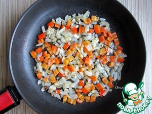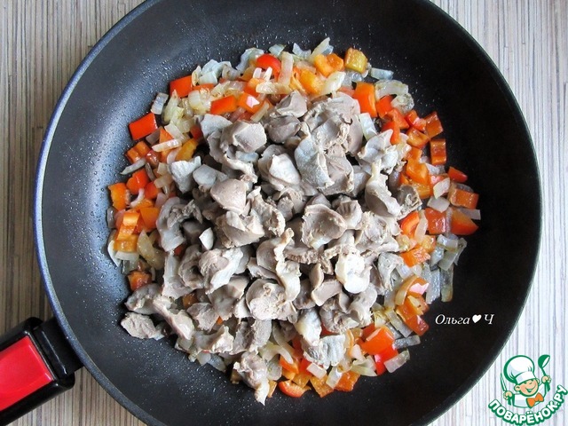 Приготовьте начинку. Куриные желудочки заранее хорошо промойте, нарежьте кусочками и отварите до мягкости с лавровым листом, бутонами гвоздики и 1/4 луковицы. Оставшийся лук и сладкий перец мелко нарежьте, обжарьте на смеси растительного и сливочного масел.