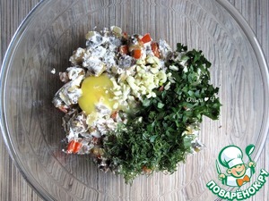 Немного остудите и выложите в миску. Добавьте зелень, чеснок и яйцо.