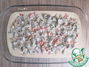 Форму для запекания (у меня 28х19 см) смажьте маслом, вылейте примерно половину жидкого теста. Добавьте начинку.