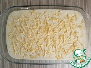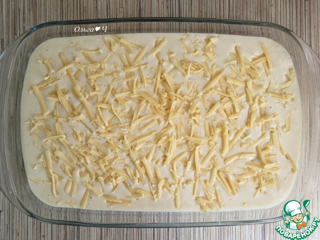 Залейте оставшимся тестом. Посыпьте тертым сыром.