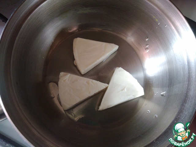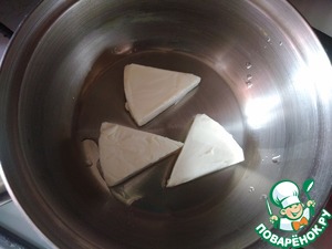 Теперь, когда всё приготовили, наливаем в маленький ковшик (кастрюлю) 1 ст л воды, ставим на огонь и выкладываем треугольники сыра.