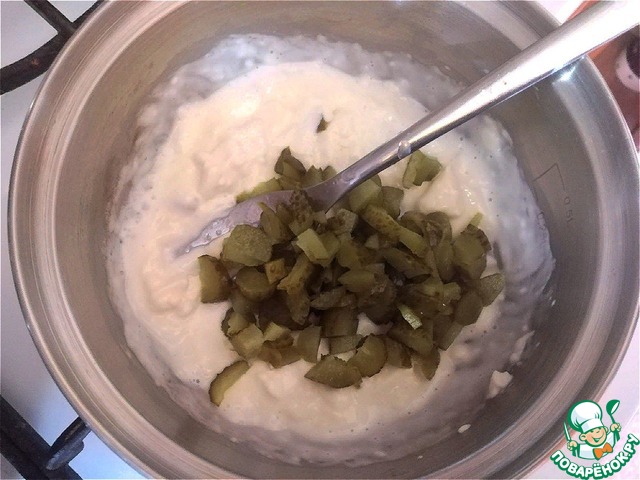 Вилкой сыр давим. Он разойдётся буквально за минуту. Сразу же выкладываем в него порезанные корнишоны. Перемешиваем и снимаем с огня.