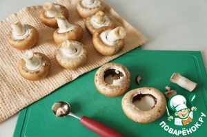 У шампиньонов убираем ножки и делаем небольшие углубления для начинки.