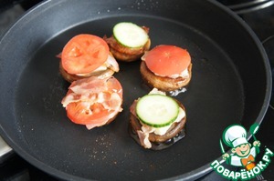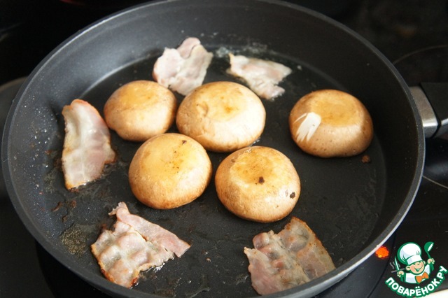 Половину шляпок и бекон обжариваем на небольшом количестве растительного масла. Выкладываем на тарелку.