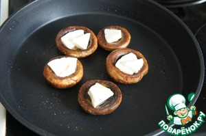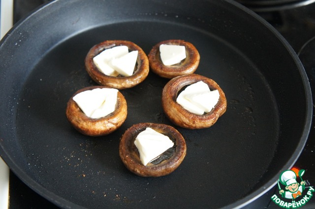 Вторую часть шампиньонов обжариваем, переворачиваем, внутрь кладём кусочки плавленного сыра.