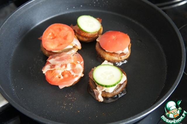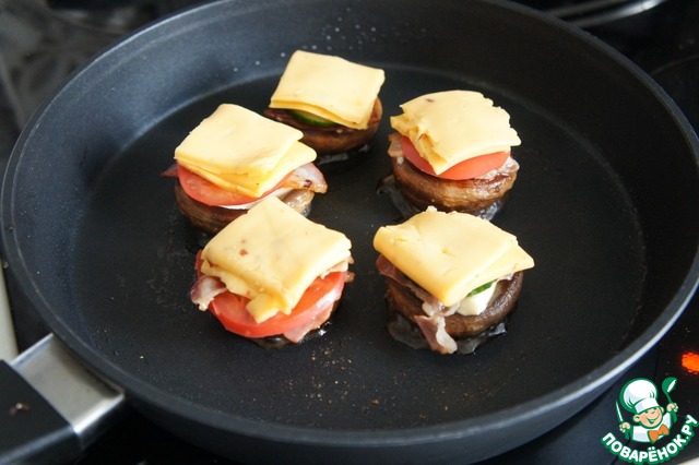 Необычная закуска: бургеры без булочек, вместо них берём грибы. Обжаренный бекон, два вида сыра и хрустящие овощи - вкусно, с остринкой, попробуйте. Тем более готовить всего 10 минут на сковороде.