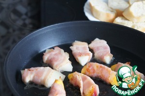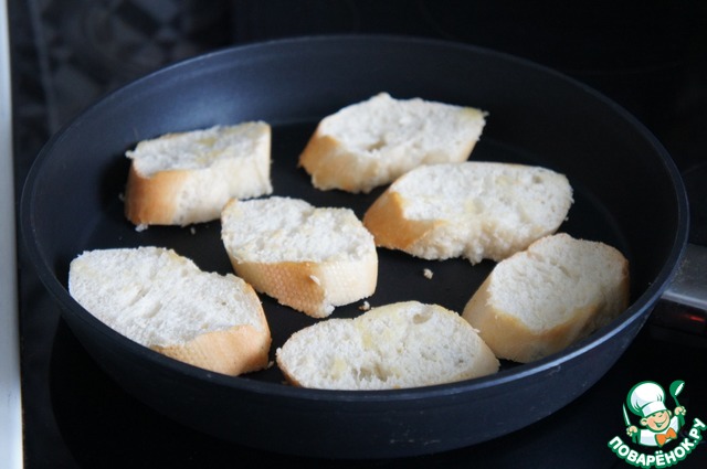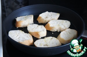 Батон нарезаем и слегка обсушиваем на сковороде с небольшим количеством масла.