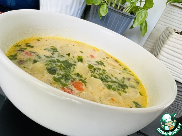 В готовый суп добавить плавленый сливочный сыр (у меня ТМ Хохланд), размешать до растворения и дать прокипеть ещё 2-3 минуты. -