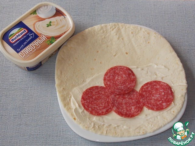 Рецепт «Сытная тортилья с сыром и колбасой»: