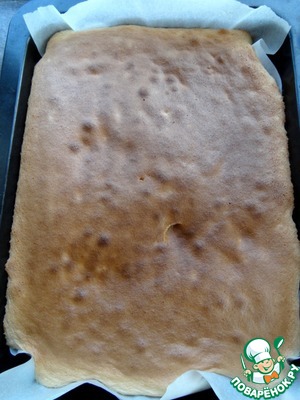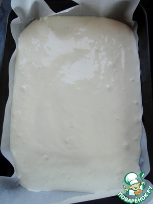 Переложить тесто в абсолютно любой противень (или форму), который предварительно надо застелить бумагой для выпечки.