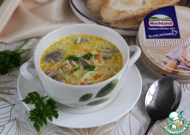 Добавьте в суп мелкую вермишель и плавленый сливочный сыр ТМ Hochland, хорошо перемешайте, доведите суп до готовности вермишели.