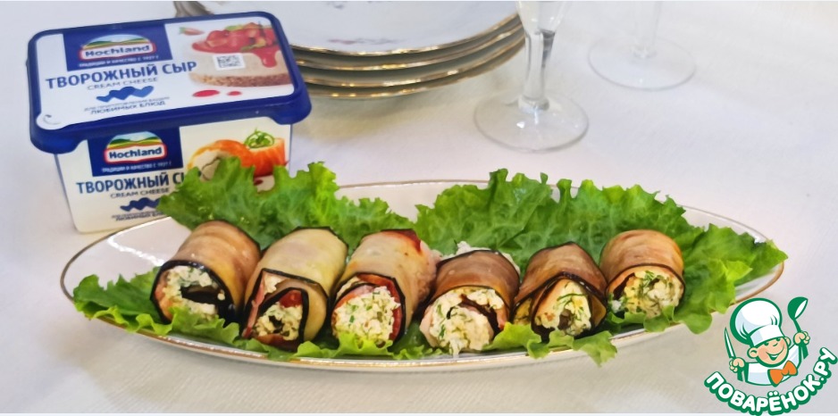 На баклажаны выложить тонкие ломтики грудинки или бекона и сырную начинку. Свернуть в рулетики.