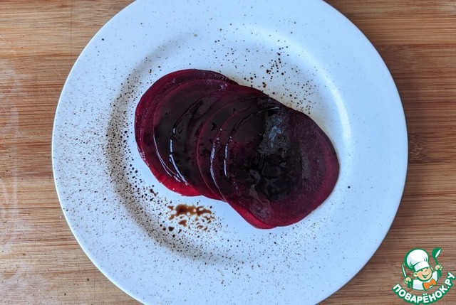 Вареную свеклу чистим, режем тонкими слайсами или трём на специальной тёрке, сбрызгиваем бальзамическим уксусом.