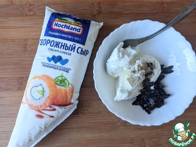 Чернослив мелко режем. Если сухой, то предварительно запариваем. Добавляем чернослив к творожному сыру. Выдавливаем чеснок, добавляем соль, перец, перемешиваем.