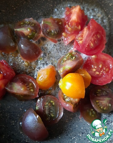 Помидоры режем достаточно мелко и обжариваем на сливочном масле с добавлением сухого чеснока и соли в течение 5 минут