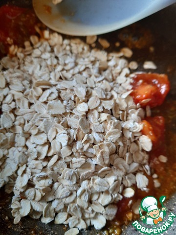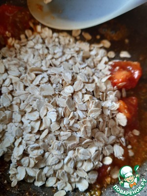Добавляем к помидорам овсянку, перемешиваем и добавляем воду. Столько, чтоб овсянка была покрыта водой. Оставляем под крышкой на небольшом огне минут на 15 (мои хлопья впрятся 20 минут)