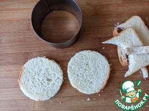 Для приготовления этой закуски можно взять багет и нарезать его. Или взять тостовый хлеб и вырезать из него круглые основания для нашей закуски. Хлеб подсушиваем на сковороде-гриль.