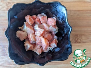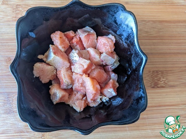 Малосольную рыбу лососевых пород разделываем на филе, режем такими же мелкими кубиками. У меня - сима собственного посола.