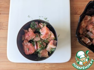 Половину заправки наливаем в порезанную свеклу, остальную в малосольную рыбку. Также в рыбу кладём рубленный укроп. Перемешиваем.