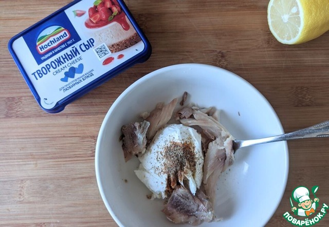 К творожному сыру кладём кусочки рыбы, добавляем сок лимона, паприку, молотый перец.