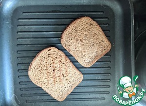 На сковороде-гриль подсушиваем тостовый хлеб, в данном сочетании предпочитаю ржаной хлеб. Можно, конечно, брать любой хлеб, багет, хлебцы.