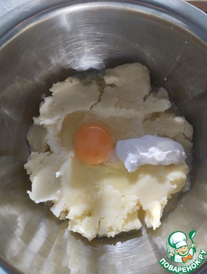 • Картофельное пюре смешиваем с растопленным сливочным маслом, яйцом и щепоткой соды. Тщательно вымешиваем до получения однородной массы.