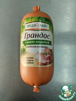 • В данном рецепте я использовала вареную колбасу с кусочками филе бедра индейки от ТМ "Индилайт".