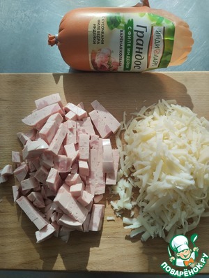 • Колбасу режем кубиком, сыр трём на крупной терке.