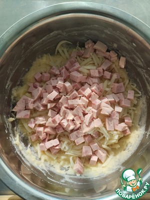 • К картофельной массе добавляем сыр и колбасу и снова мешаем.