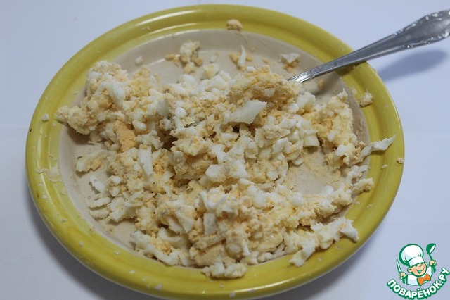Яйцо и масло хорошо размять вилкой.