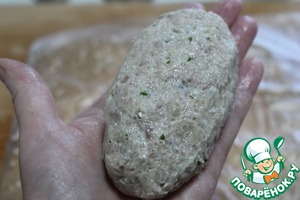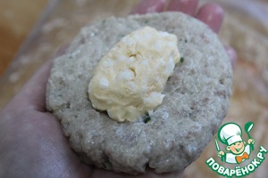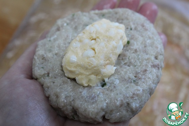 Влажными руками скатать одну часть фарша и расплющить в лепешку.