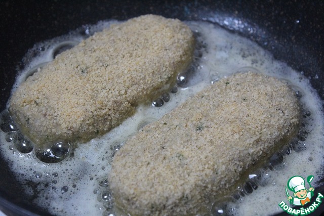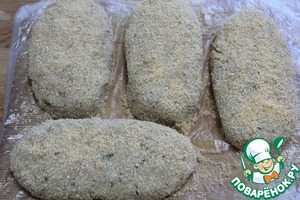 Прокатать в сухарях и выложить на блюдо, выложенное пищевой пленкой. -
