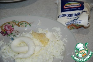 Сварить яйца, почистить, разделить на белки и желтки. Белки натереть на мелкой терке, добавить творожный сыр, тертый чеснок, соль.