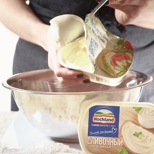 В миску положить Сыр плавленый ТМ Hochland Сливочный.