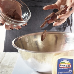 Добавить столько же молочного шоколада и растопить на водяной бане постоянно помешивая до полной однородности.