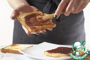 Смазать шоколадным сыром хлеб.