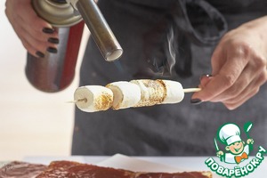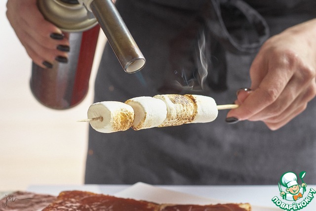 Маршмэллоу обжечь горелкой до темной корочки. Соблюдайте технику безопасности!