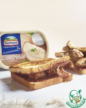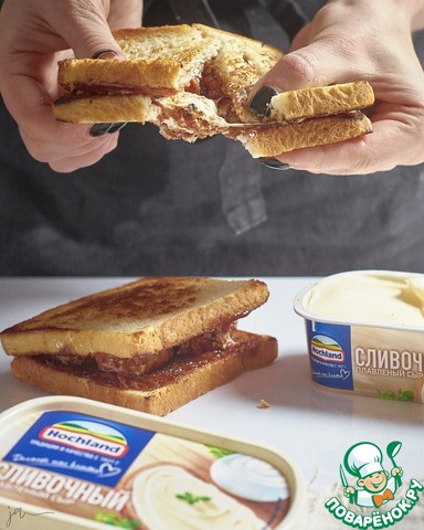 Любителям сладких бутербродов посвящается! Сэндвич по мотивам популярного американского десерта из крекеров маршмеллоу и шоколада, который так любят скауты. Справится даже ребенок! Плавленый сыр ТМ Hochland Сливочный добавит блюду нежности, смягчит приторную сладость молочного шоколада и маршмэллоу. Неожиданно и очень вкусно.