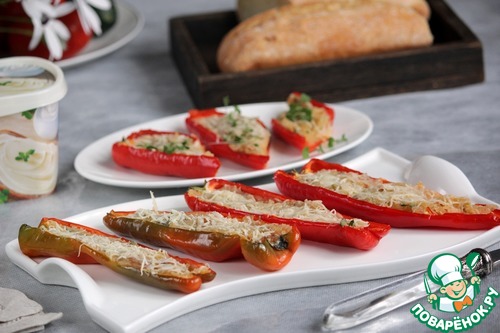 Начините перчики полученной смесью, выложите на противень или в форму, посыпьте сыром. Поставьте в разогретую духовку до 190* и готовьте минут десять до подрумянивания.