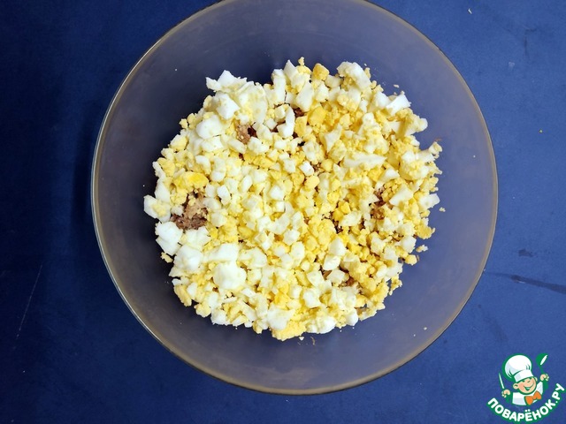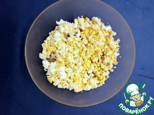 • Яйца отварить вкрутую, очистить, остудить. Мелко нарезать кубиками.