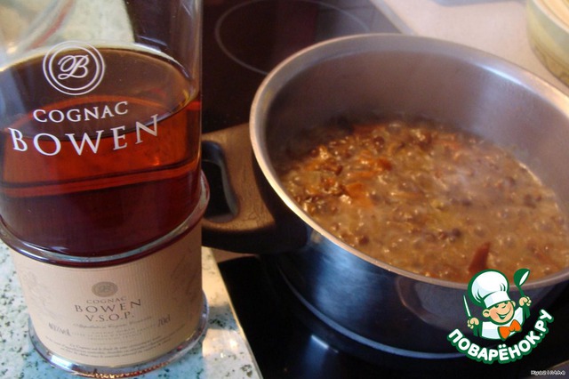 Когда закипит, добавляем бульонный кубик или порошок, соль и перец по вкусу, и 1 ст.л. коньяка