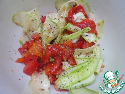Помидоры нарежьте на мелкие кусочки, с кабачка, с помощью овощечистки нарежьте ленты, добавьте запеченые перцы с небольшим количеством ароматного масла, в котором они готовились. Запеченные перцы в ароматной масляной заливке - моя зимняя заготовка. Поперчите по вкусу. Я не солила, т. к. перцы уже достаточно соленые плюс соус песто имеет в своем сотаве соль. Если очень любите базилик, добавьте сюда часть листьев, оставив несколько для подачи. Мне хватило того базилика, из которого я готовила соус песто. -