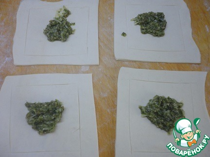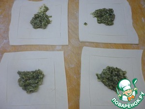 Раскатайте слоеное тесто в пласт примерно 26 х 26 см, разрежьте на 4 равных квадрата и сразу выложите на противен, застеленный бумагой. Потом, с начинкой, сделать это будет проблематично ( не повторяйте моей ошибки:). С помощью ножа, не прорезая (!), а слегка продавливая, обозначьте границы бортиков. На каждый квадрат выложите по 1 ч. л. песто и распределите внутри границ квадрата.